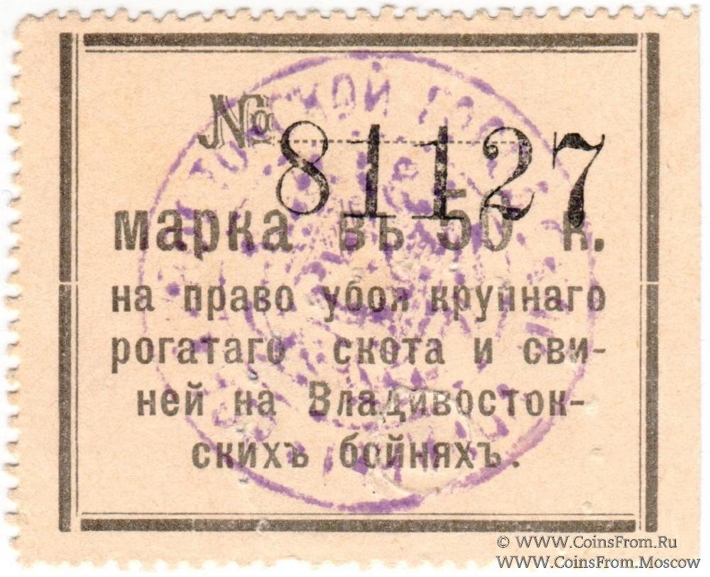 Марка. На право убоя крупного рогатого скота и свиней на Владивостокских бойнях. Владивостокская Городская Управа (В.Г.У.).