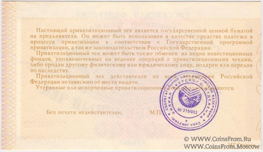 Приватизационный чек 1992 года. Печать Филиала Якутского отделения Сбербанка РФ. Серия 11. Государственная ценная бумага. ГОЗНАК.