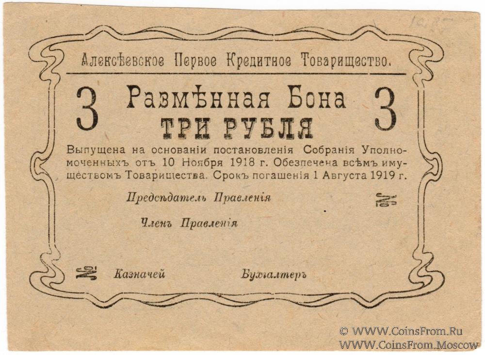 Разменная бона 1918 г. Бланк. Выпуск 1: на основании постановления Собрания Уполномоченных от 10 ноября 1918 г. Срок погашения 1 августа 1919 г. Алексеевское Первое Кредитное Товарищество.