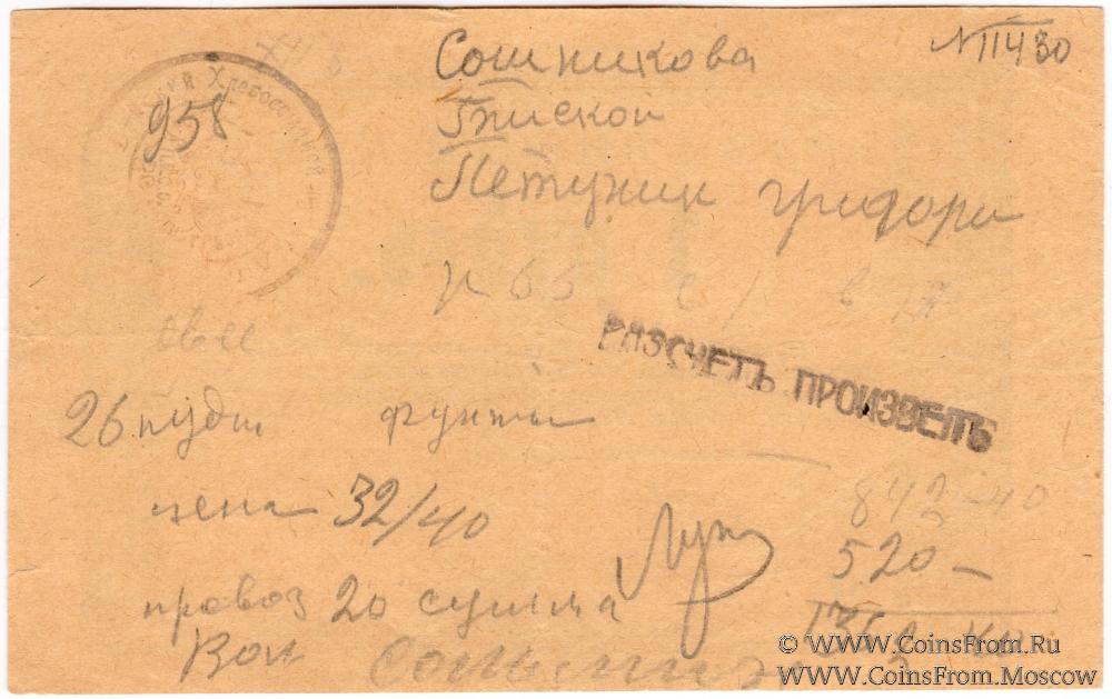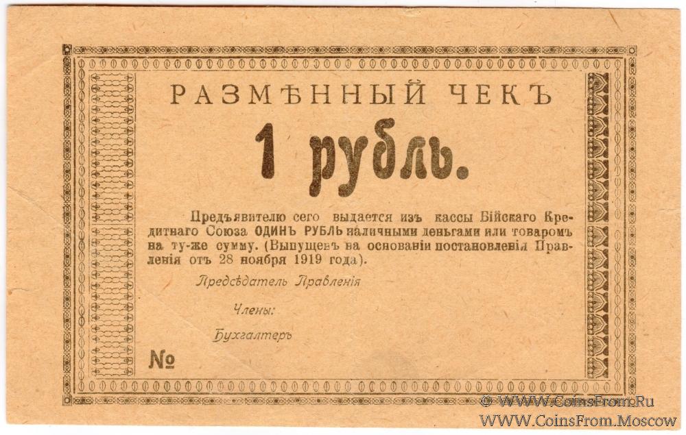 Разменный чек 1919 г. На реверсе печать П.К.С.С., рукописные заметки, номер (карандашом) и штамп "РАСЧЕТЪ ПРОИЗВЕЛЪ". Без перфорации. Бийский Кредитный союз.
