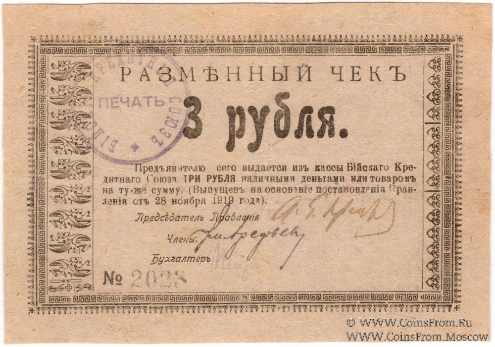 Разменный чек 1919 г. Законченный без перфорации. Бийский Кредитный союз.