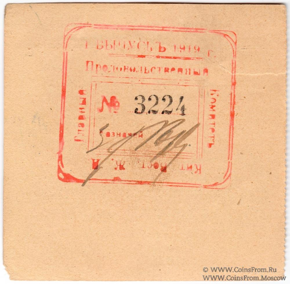 Штамп прямоугольный красного цвета: "Номер / Казначей" (по центру в две строки в прямоугольной рамке) / "Главный Продовольственный Комитетъ Кит. Вост. Ж. Д." (по периметру прямоугольника) / "ВЫПУСКЪ 1919 г." (сверху).