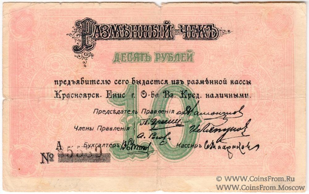 Разменный чек 1919 г. 2-й выпуск. Серия А. Красноярское Общество Взаимного Кредита.