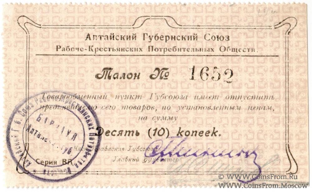 Талон без даты. Серия ВА. Алтайский Губернский Союз Рабоче-Крестьянских Потребительских Обществ.