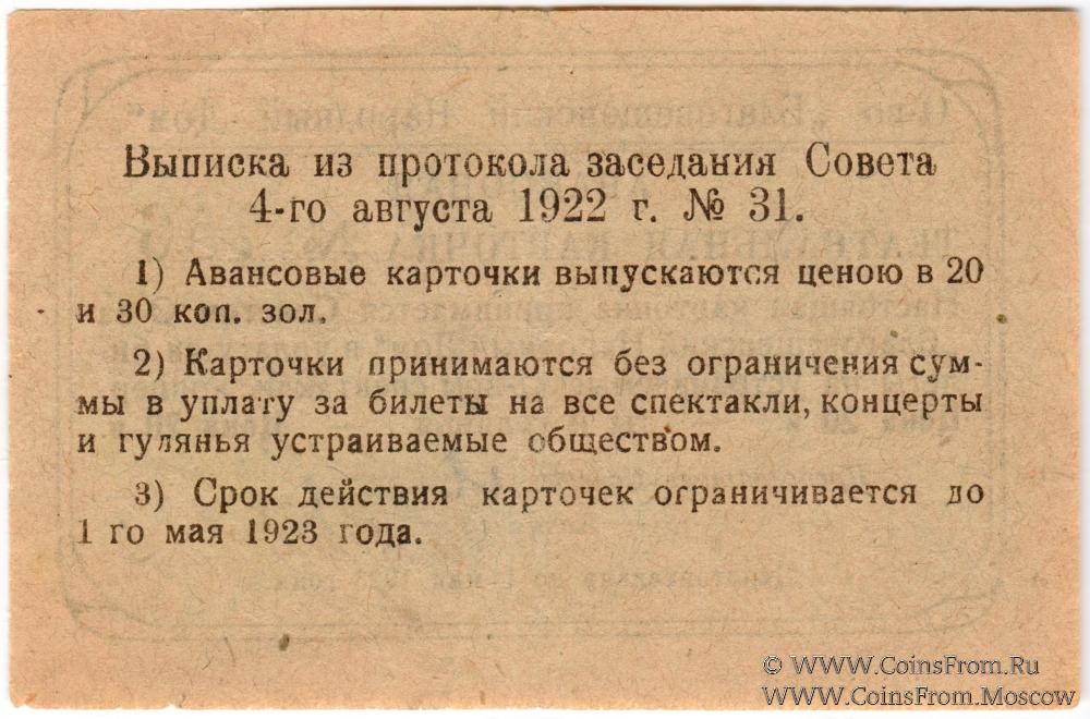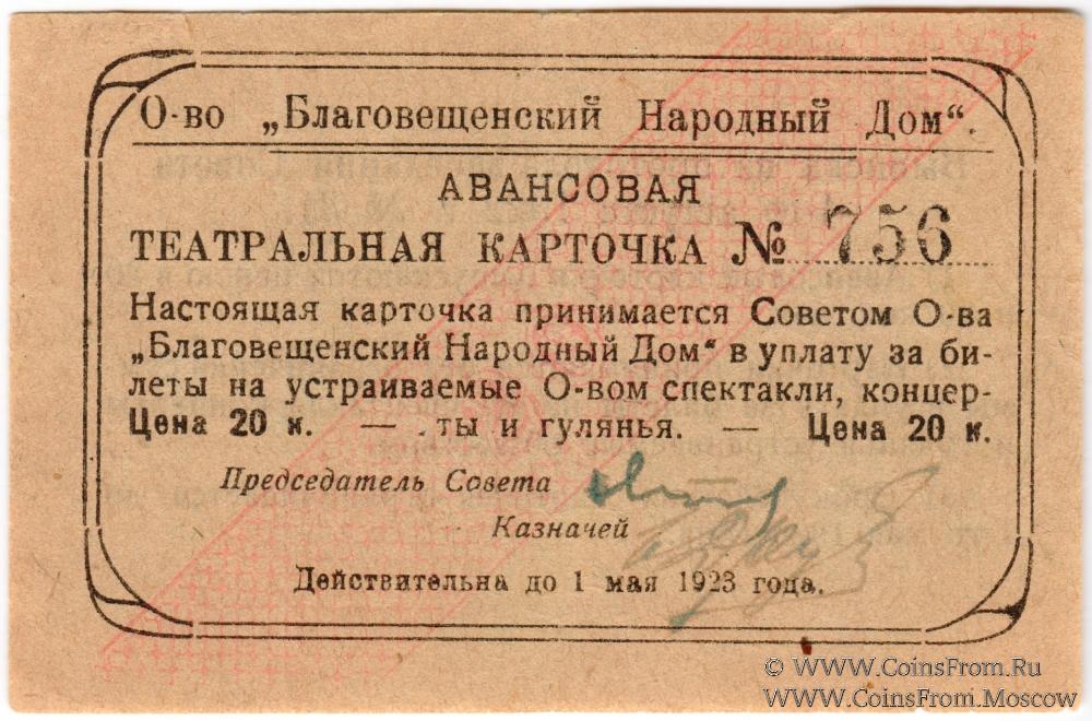 Авансовая театральная карточка (в копейках золотом). Общество "Благовещенский Народный Дом".