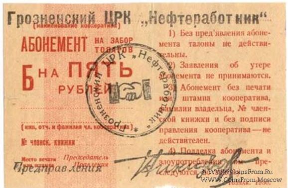 Талон 15 копеек к абонементу 5 рублей 1930 г. Литера Б. Горизонтальный. Красный текст. Надпечатка "Гр. ЦРК" (ниже). Сцепка из 3 штук (вертикальная). Грозненский Центральный Рабочий Кооператив "НЕФТЕРАБОТНИК". ГОЗНАК.