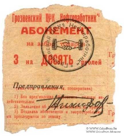 Талон 15 копеек к абонементу на 10 рублей без даты. Литера З. Красный текст. Грозненский Центральный Рабочий Кооператив "НЕФТЕРАБОТНИК".