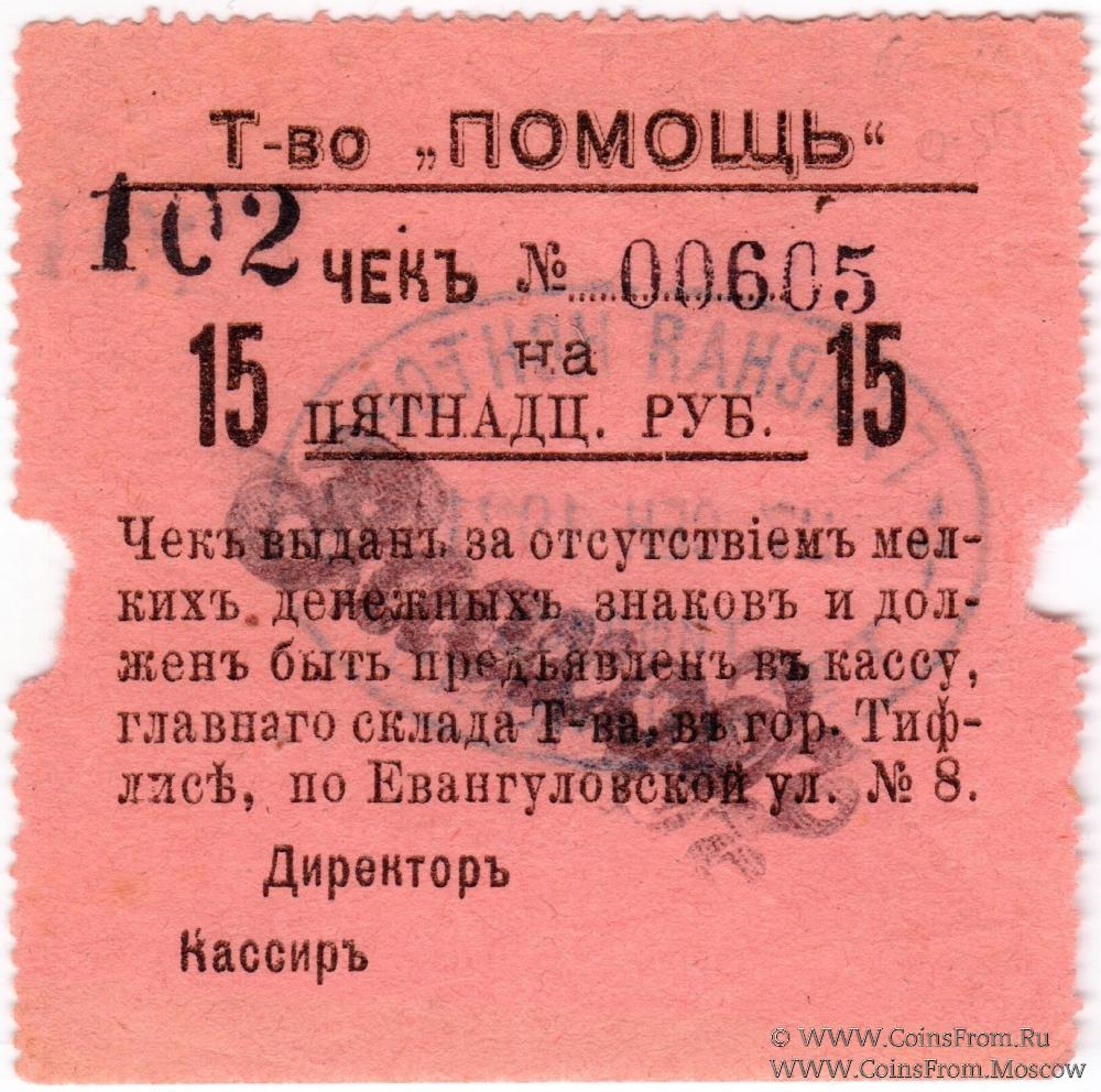 Чек. Товарищество "Помощь", г. Тифлис. Аверс: Надпечатка "102", "РАСХОДЪ". Цифры номинала узкие. Буквы узкие. Реверс: овальная печать главной конторы Товарищества "Помощь" (27 сентября 1921).