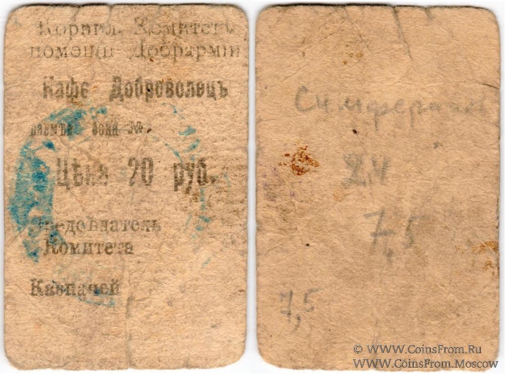 Разменная бона без даты (1920 г.). Корниловский Комитет помощи Добрармии. Кафе Доброволец.