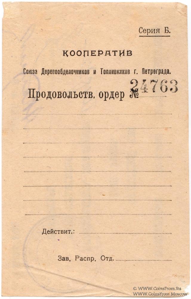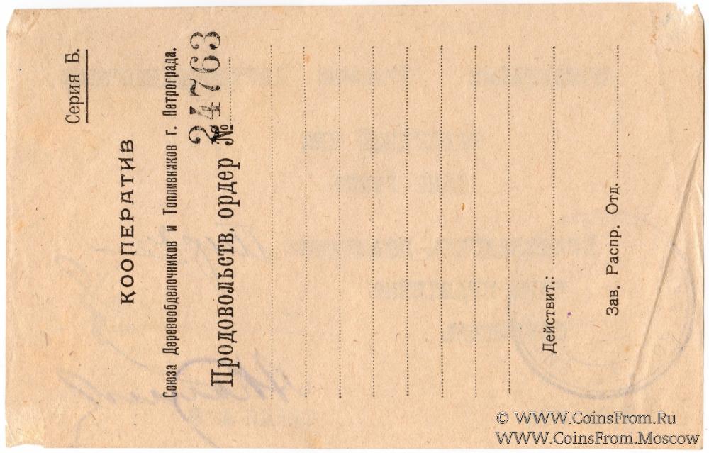 На реверсе: Продовольственный Ордер № 24763 (Серия Б) Кооператива Союза Деревообделочников и Топливников г. Петрограда. Объединенный Кооператив "Красный Деревообделочник".