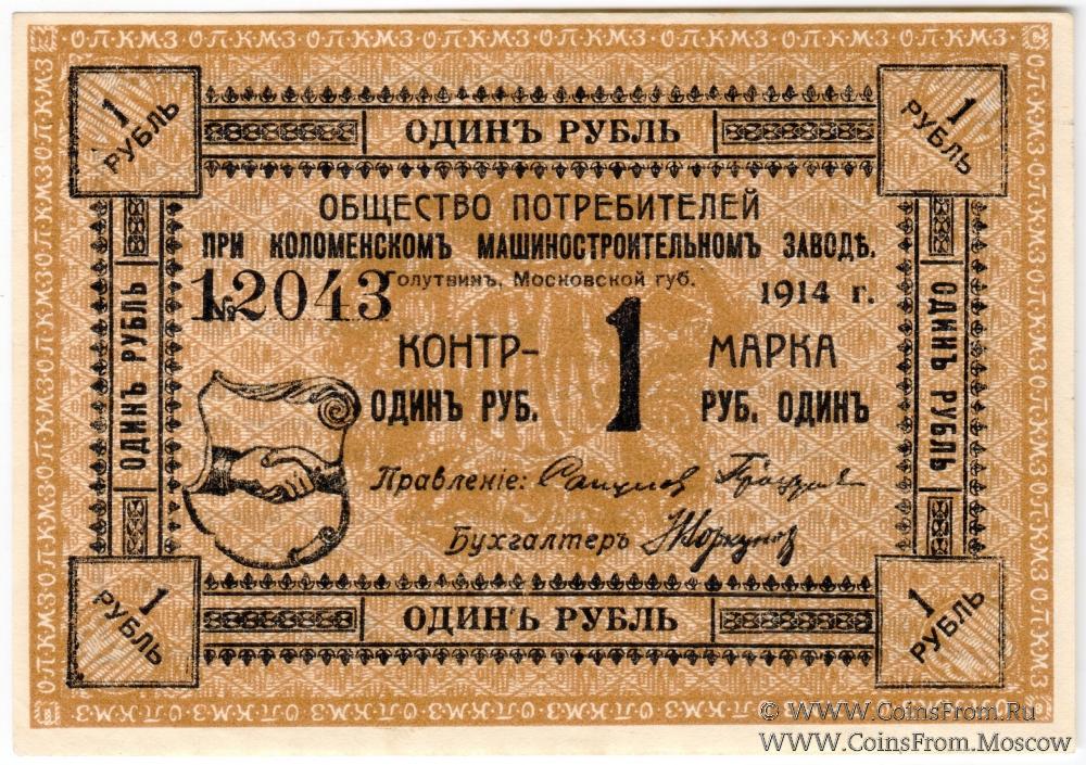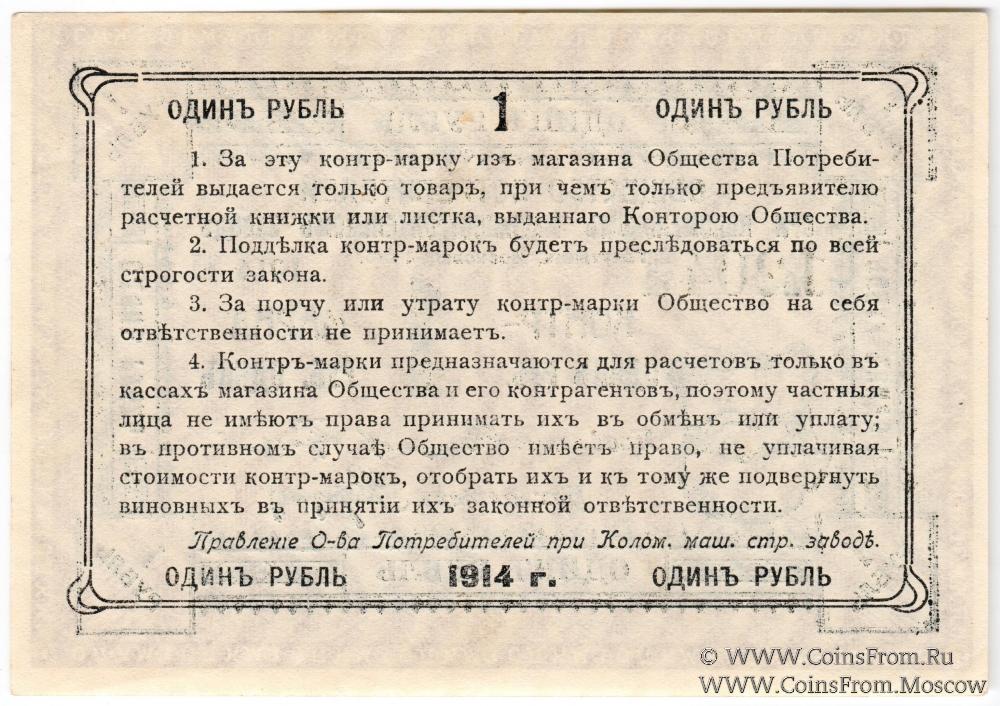 Контрольная марка 1914 г. Без серии. Водяной знак - "вертикальные волны". Общество потребителей при Коломенском машиностроительном заводе (ОПКМЗ).