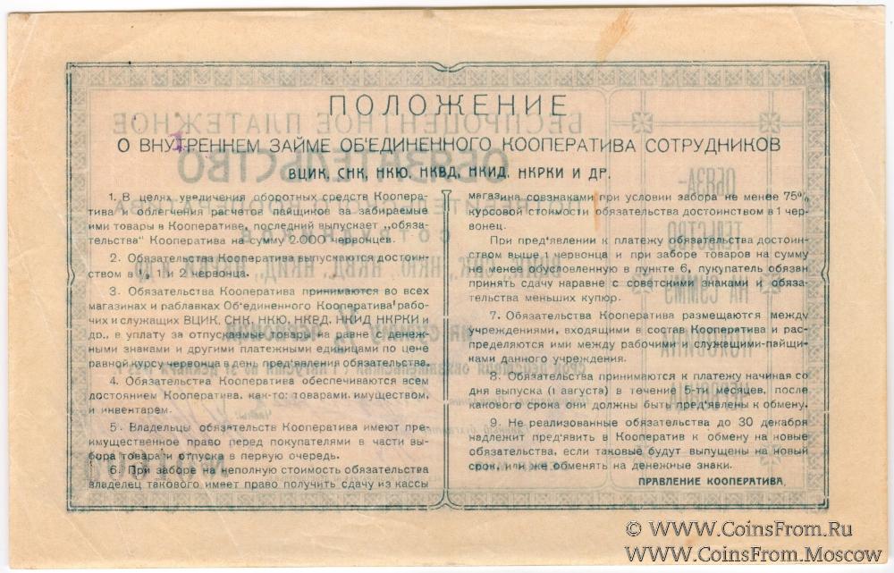 Беспроцентное платежное обязательство. Бумага жёлтая. Потребительский кооператив сотрудников ВЦИК, СНК, НКЮ, НКВД, НКИД, НКРКИ и др.