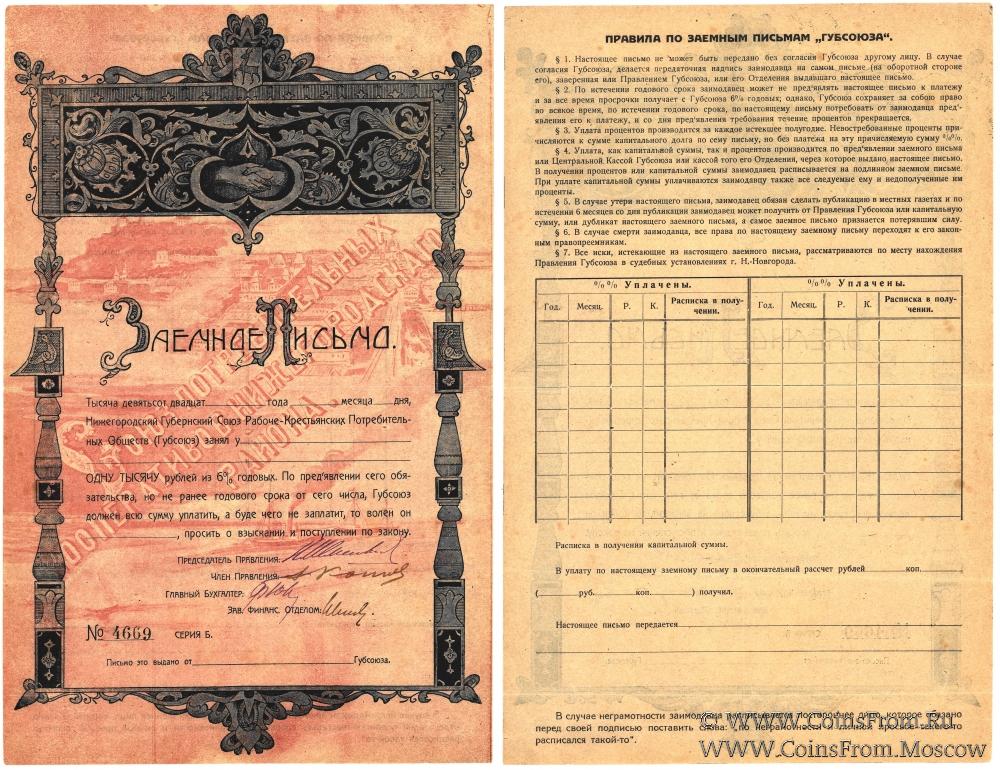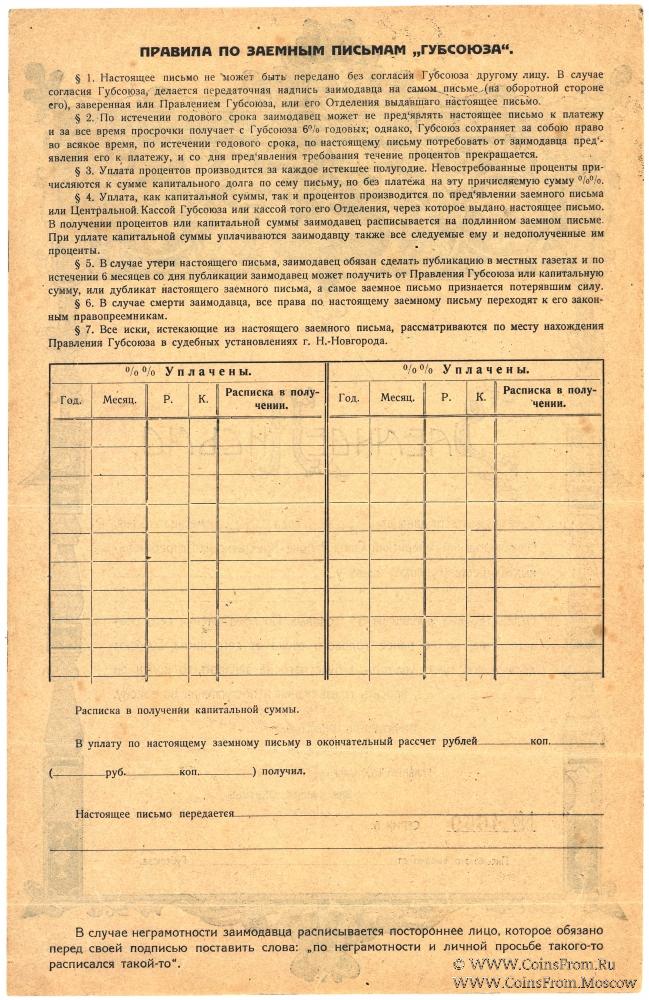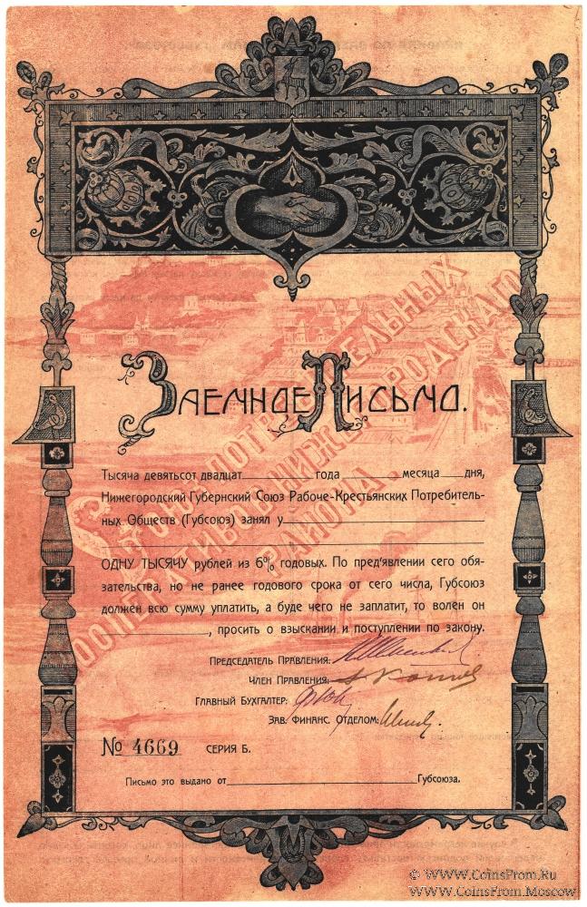 Заёмное письмо 1920 г. Серия Б. Бланк с подписями. Нижегородский Губернский Союз Рабоче-Крестьянских Потребительных Обществ (ГУБСОЮЗ).