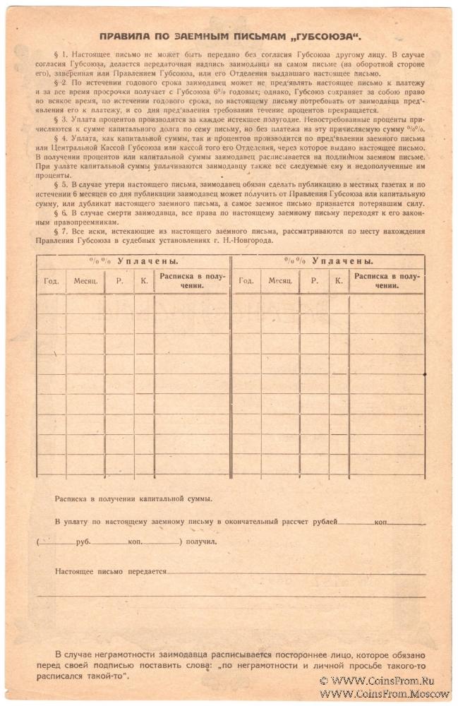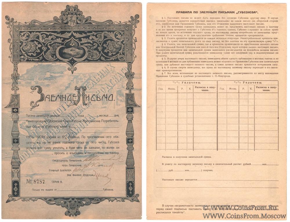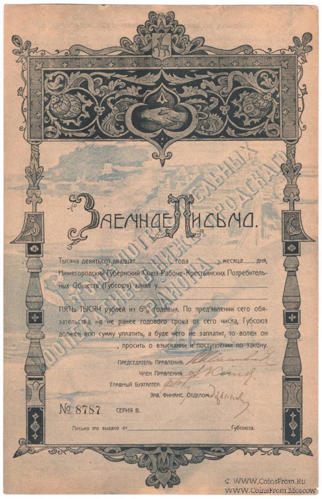 Заёмное письмо 1920 г. Серия В. Бланк с подписями. Нижегородский Губернский Союз Рабоче-Крестьянских Потребительных Обществ (ГУБСОЮЗ).