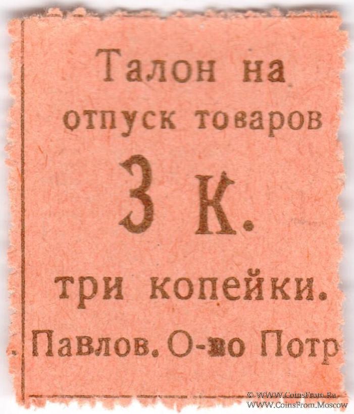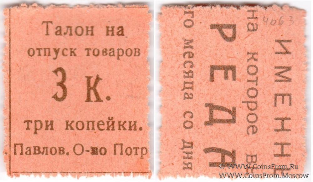 Талон без даты. Оранжевый оттенок. Вариант шрифта: цифра "3" узкая, с засечками. Павловское Общество потребителей.