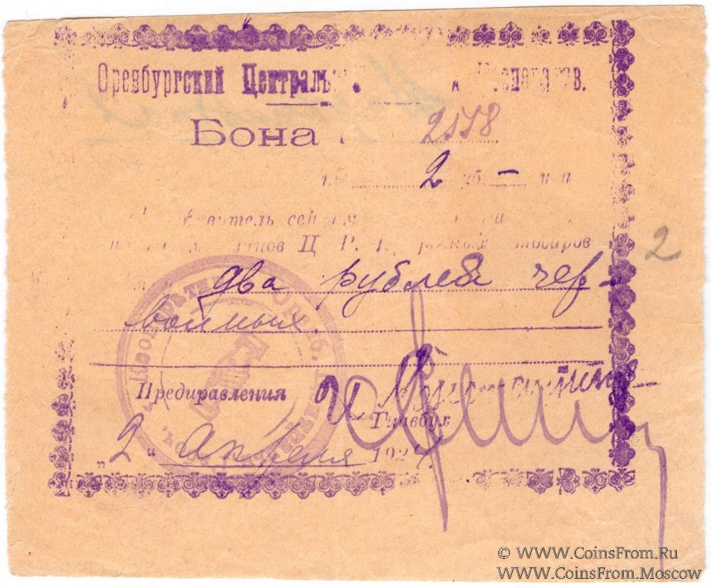 Бона 1923-1924 гг. Бумага жёлтая. Дата: "2 апреля 1924 г". Оренбургский Центральный Рабочий Кооператив.