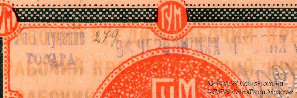 Бона (без права передачи) без даты (1921 г.). В червонных рублях. Вариант 3 и 5 - надпечатки (штампы) на аверсе. Печать на реверсе. Принимаются только ГУМом по месту выдачи. ГУМ - Государственный универсальный магазин.