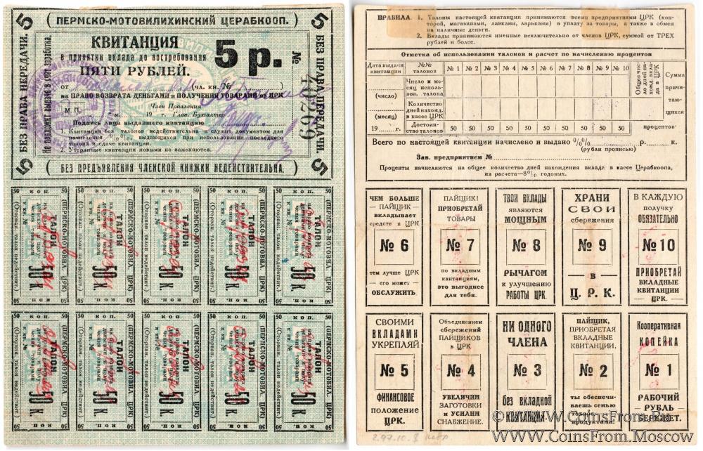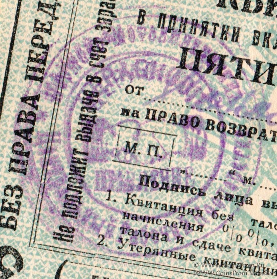 Квитанция 5 рублей без даты с 10 талонами по 50 копеек.