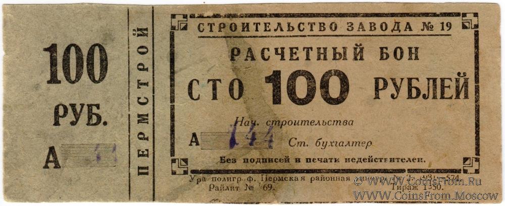 Расчетный бон. Серия А (зеленые). Бланк с купоном. Строительство завода №19. ПЕРМСТРОЙ.