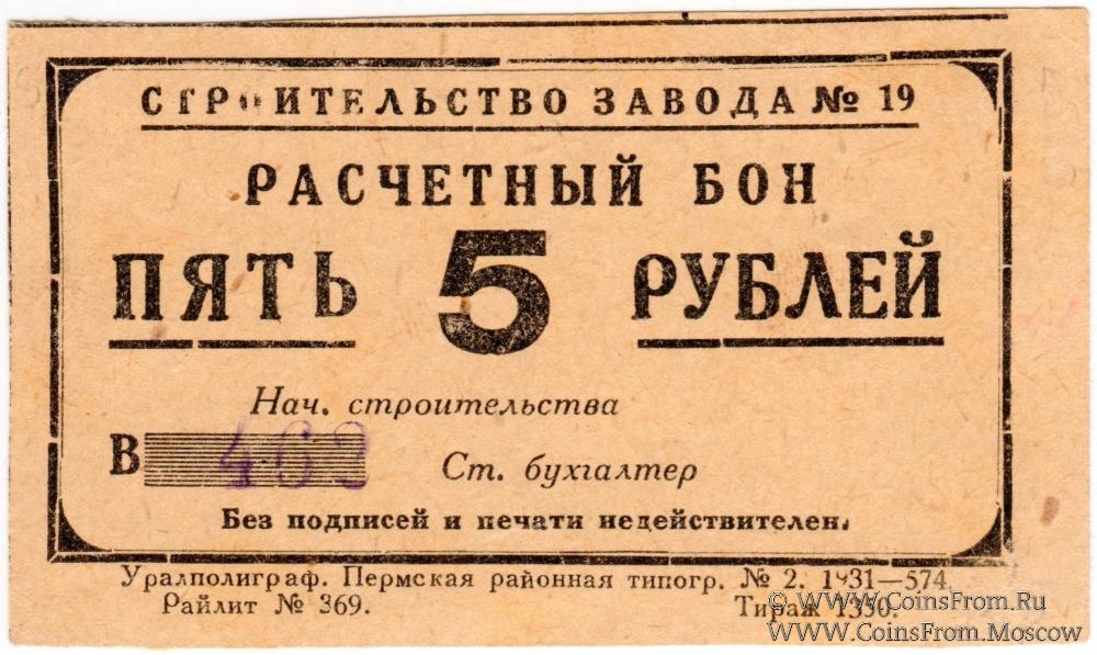 Расчетный бон. Серия В (бежевые). Строительство завода №19. ПЕРМСТРОЙ.
