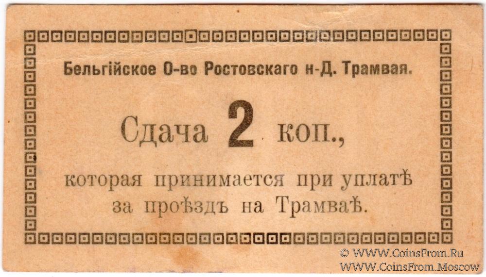 БРАК печати: фон аверса на реверсе (перевернут). Цифра "2" - узкая. Печать на реверсе. Сдача, которая принимается при оплате за проезд на Трамвае. Бельгийское Общество Ростовского НД Трамвая.