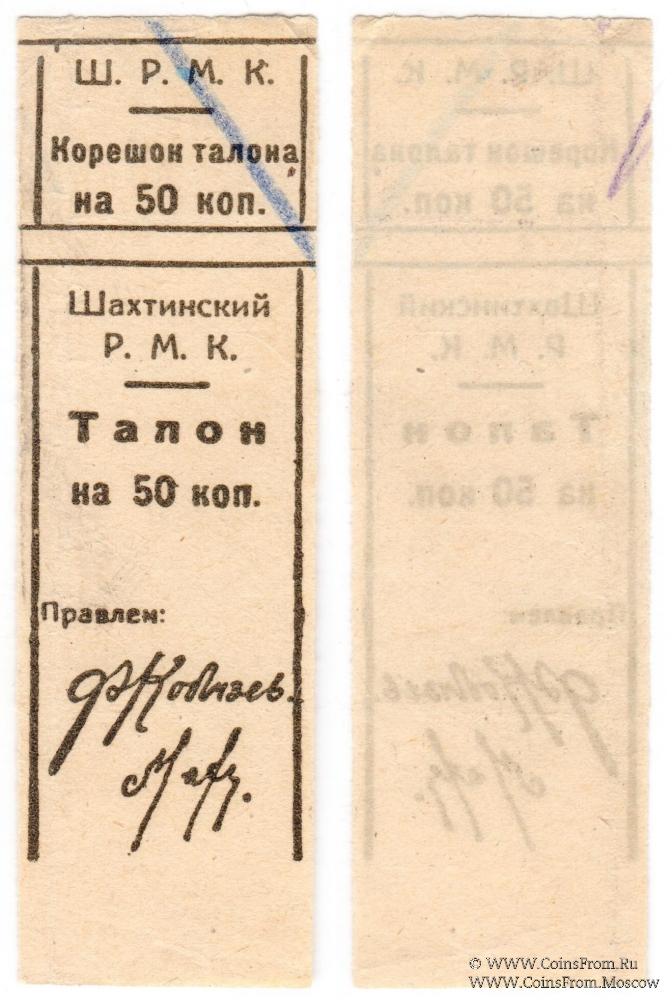 Талон без даты. Бумага белая. Шахтинский Рабочий Многолавочный Кооператив (Р.М.К.).