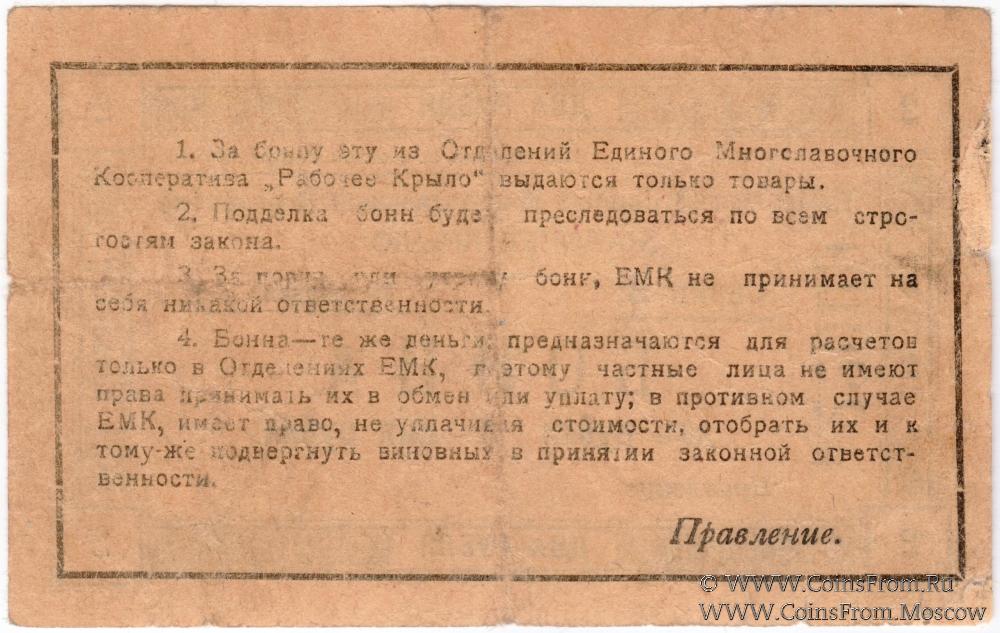 Бонна без даты (1919 г.). Серия В. С оттиском печати и факсимиле подписей ответственных лиц. Единый Многолавочный Кооператив "Рабочее крыло".