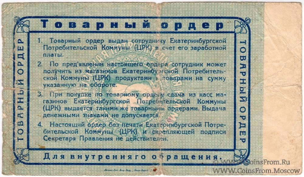 Товарный ордер (в валюте 1923 г.). Серия А. Законченный. С белым полем слева. Синий. Екатеринбургская Потребительская коммуна (Ц.Р.К.).
