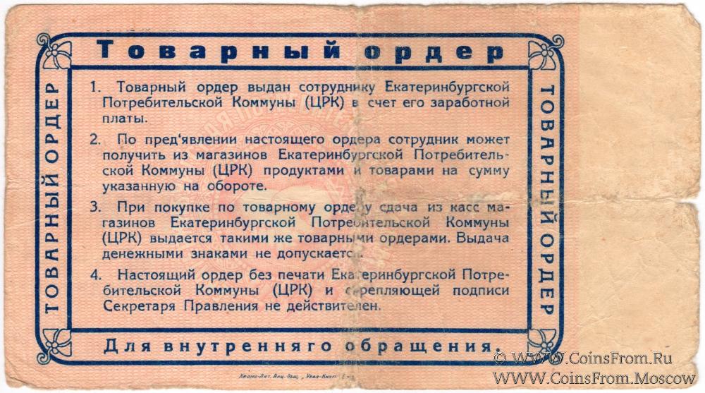 Товарный ордер (в валюте 1923 г.). Серия А. Законченный. С белым полем слева. Синий. Екатеринбургская Потребительская коммуна (Ц.Р.К.).