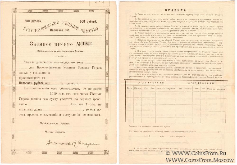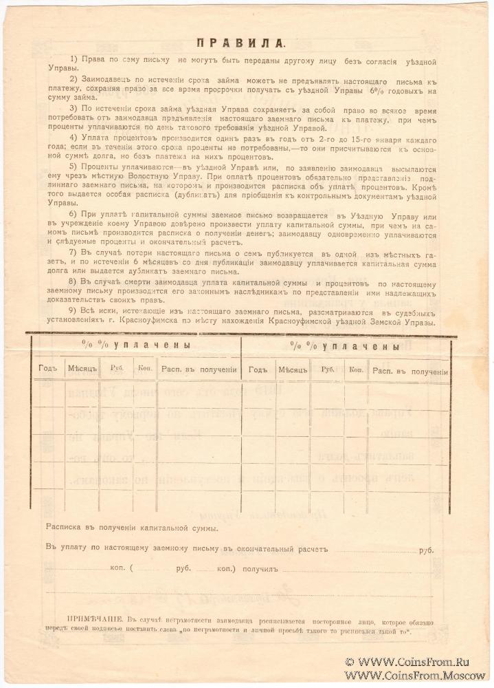 Заемное письмо. Красноуфимское Уездное Земство.