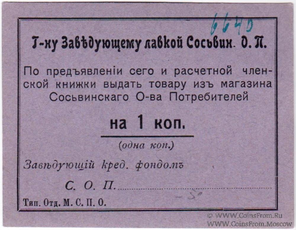 Без названия (По предъявленiи сего). Г-ну Заведующему лавкой Сосьвинского О.П. Сосьвинское Общество потребителей.