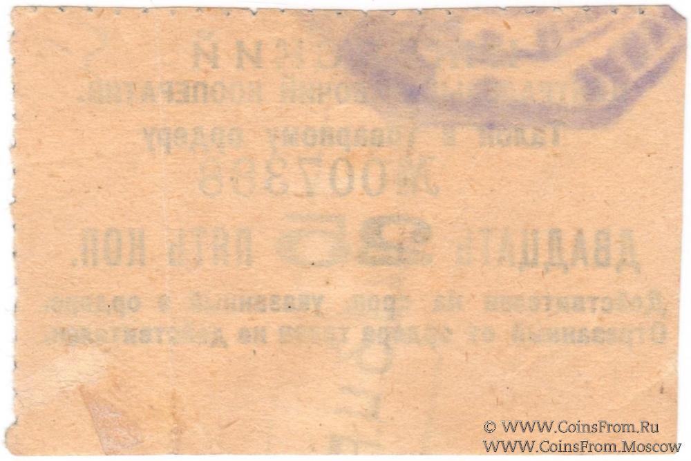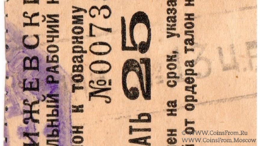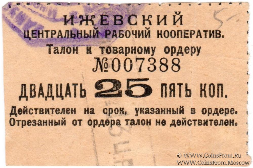 Талон к товарному ордеру без даты. Штамп (надпись в одну строку в рамке прямоугольной формы): "МАГАЗИН № 13 Ц.Р.К..". Ижевский Центральный рабочий кооператив.
