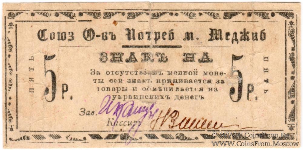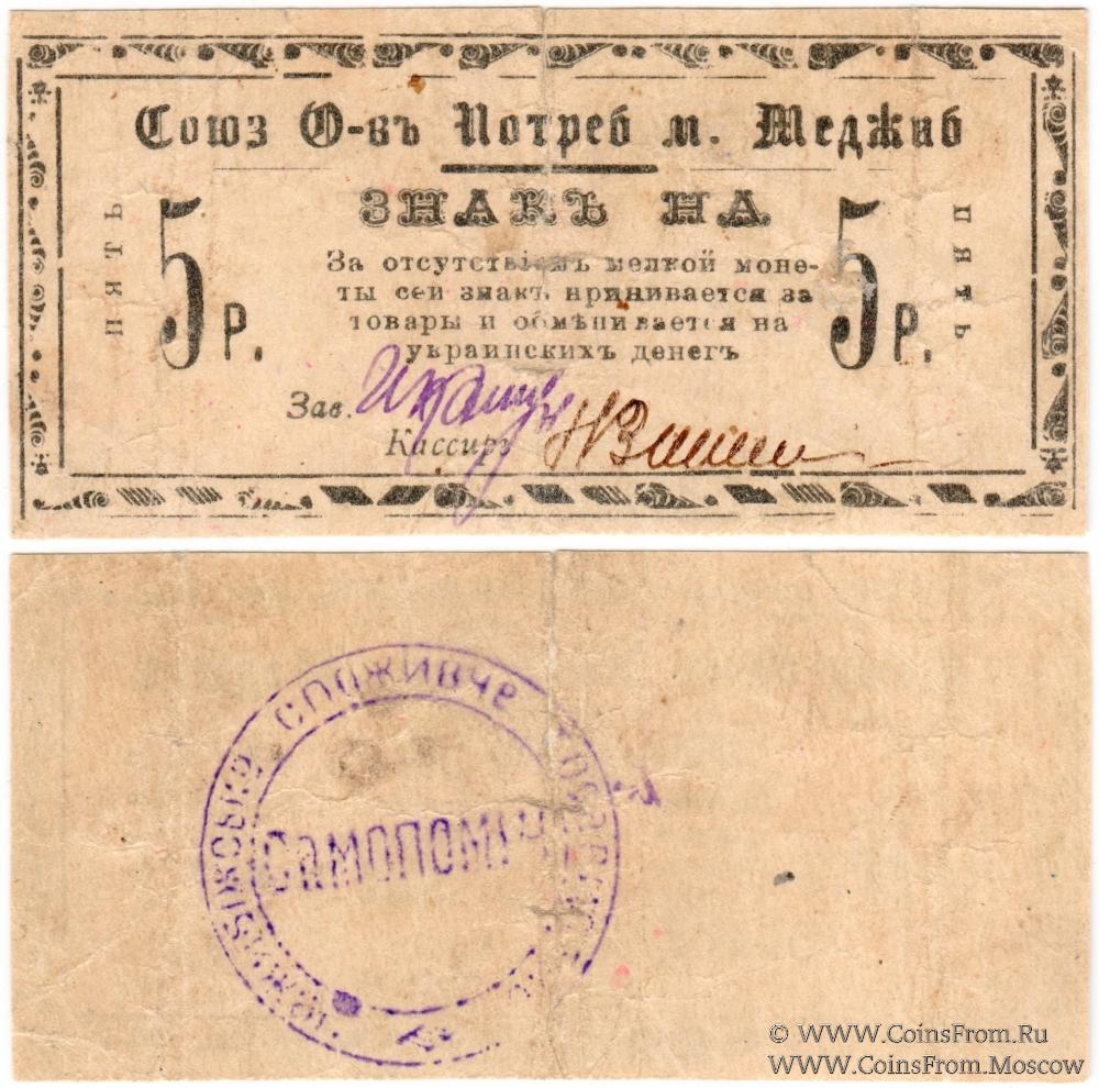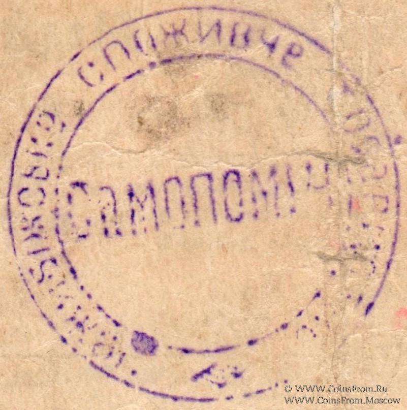 Печать круглая: "МЕДЖИБIЖСЬКА СПОЖИВЧЕ ТОВАРИСТВО *" (по кругу) "САМОПОМIЧ" (по центру) (рус.: Меджибожское потребительское общество САМОПОМОЩЬ)