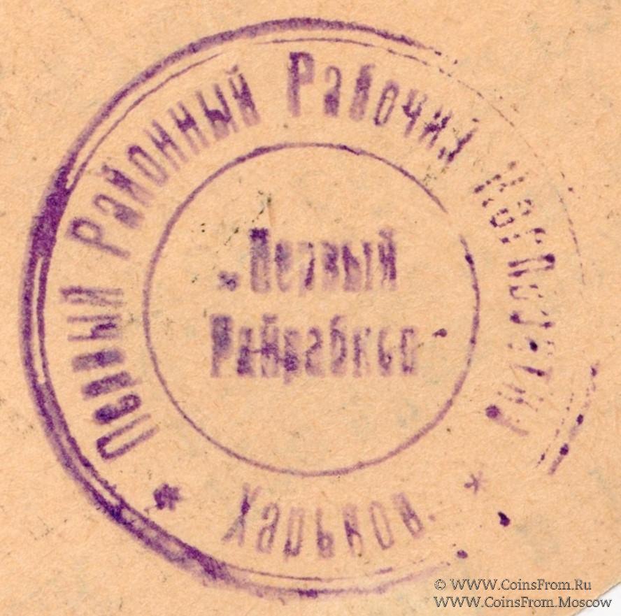 Печать круглая на реверсе: "Первый Райрабкооп" (по цеyтру, в две строки) / "Первый Районный Рабочий Кооператив * Харьков * " (по кругу).