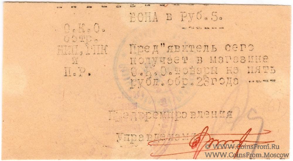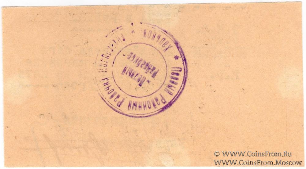 Бона без даты (1923 г.). Отпечатана на печатной машинке. Две печати на аверсе, одна на реверсе. Объединенное Кооперативное Объединение (О.К.О.) Сотрудников НКП, РНК и ПР.