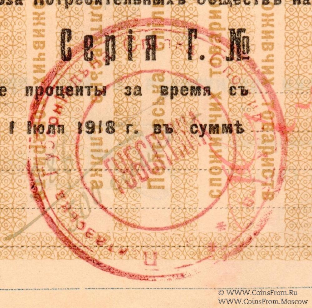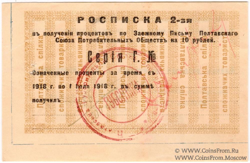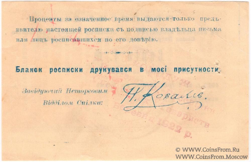 2-ая Расписка (Росписка) 1928 (1922) г. Серия Г. На аверсе номер и сумма прописью (825.000) от руки, печать и подпись красная. На реверсе штамп 1922 г., текст синий. Полтавский Союз Потребительских Обществ (Полтавська спiлка споживчих товариств).