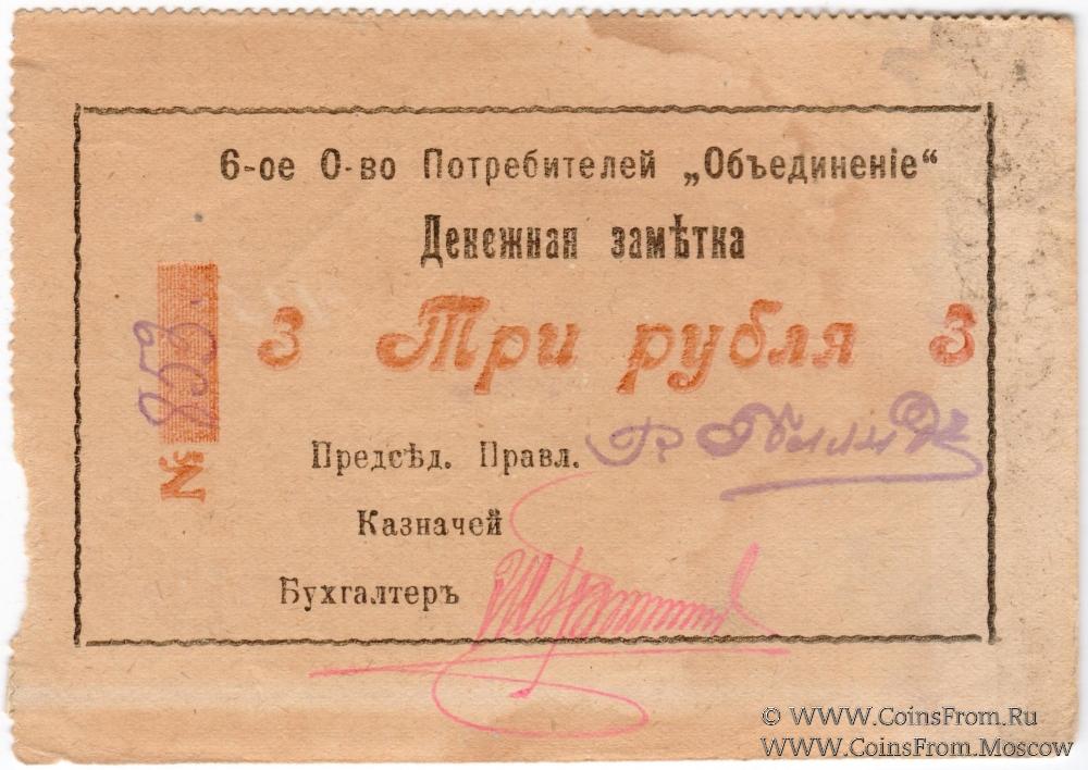 Денежная заметка без даты. Без подписи казначея и печати. Бумага на реверсе линованная. 6-е Общество потребителей "Объединение".