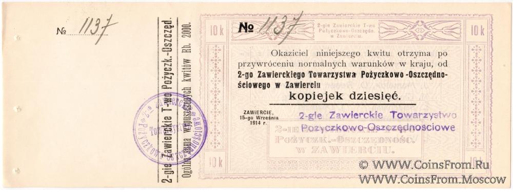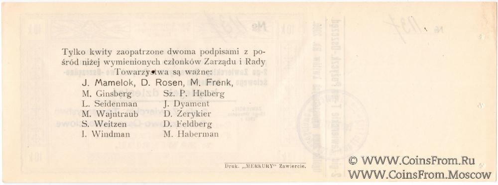 Выпуск квитанций 1914 г. 2-е Заверцкое кредитно-сберегательное общество в Заверце. Типография - Drukarnia "MERKURY' Zawiercie.