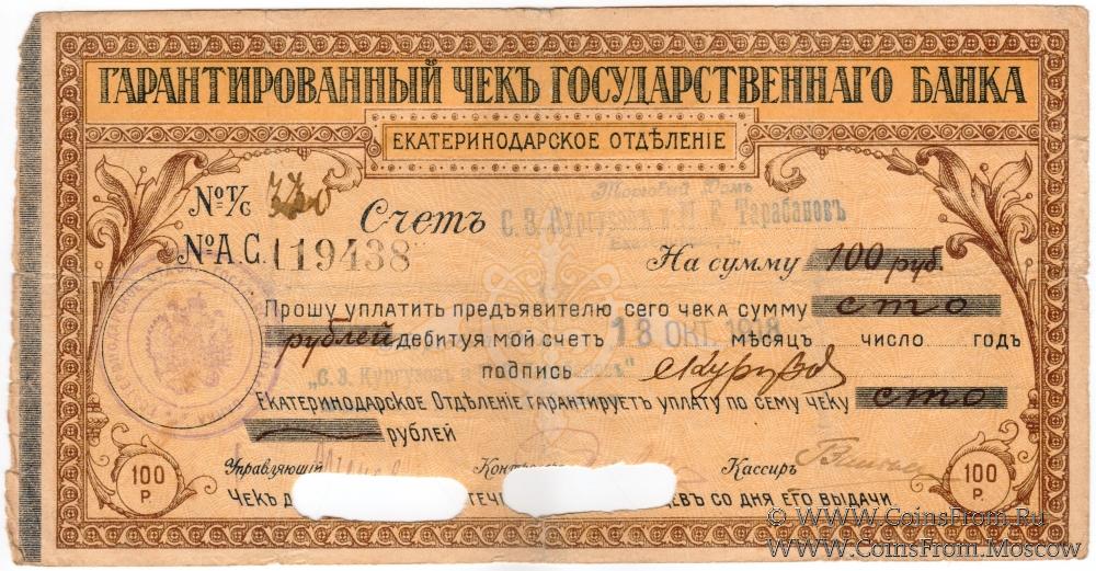 Печать: большой орел, текст: "Екатеринодарское отдъл. Государственнаго Банка".