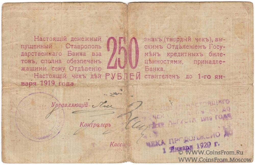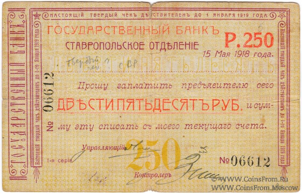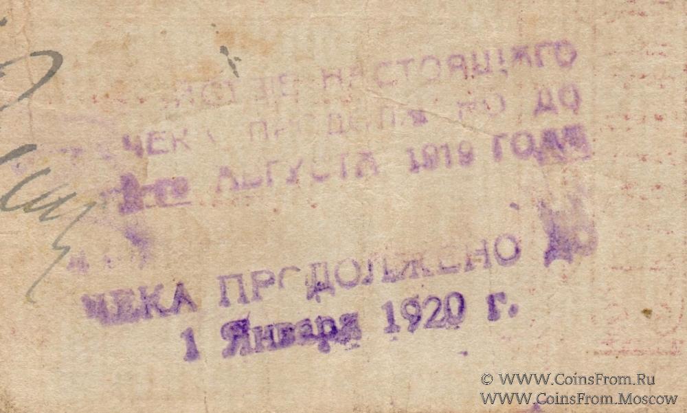 Чек гарантированный (обеспеченный) от 15 мая 1918 г. Серия 1 (действителен до 1 января 1919 г.). Два штампа продления на реверсе - до 01 августа 1919 г. и до 01 января 2020 г. Обеспечен ценностями банка (без надписи на реверсе "Гарантированный (обеспеченный) чек" ). Ставропольское Отделение Государственного Банка.