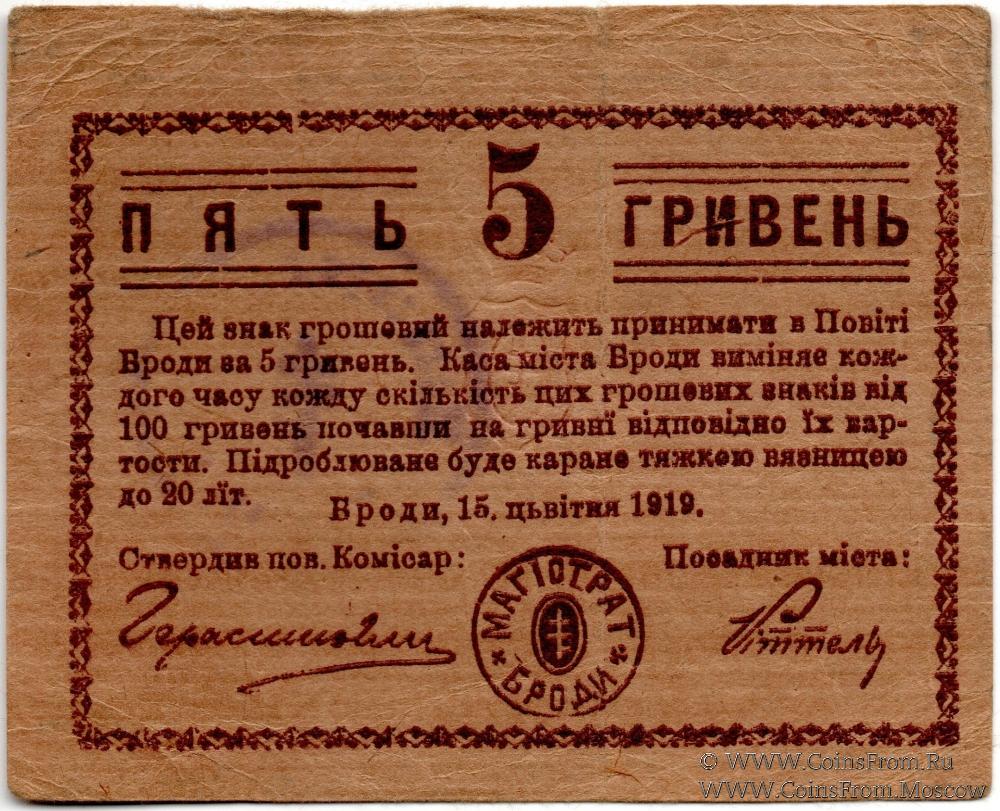 Денежный знак (Знак грошевий) 5 гривен 1919 г. Тисненая печать (крест в овале на щите). На реверсе номер, печати Комиссариата и Магистрата города.
