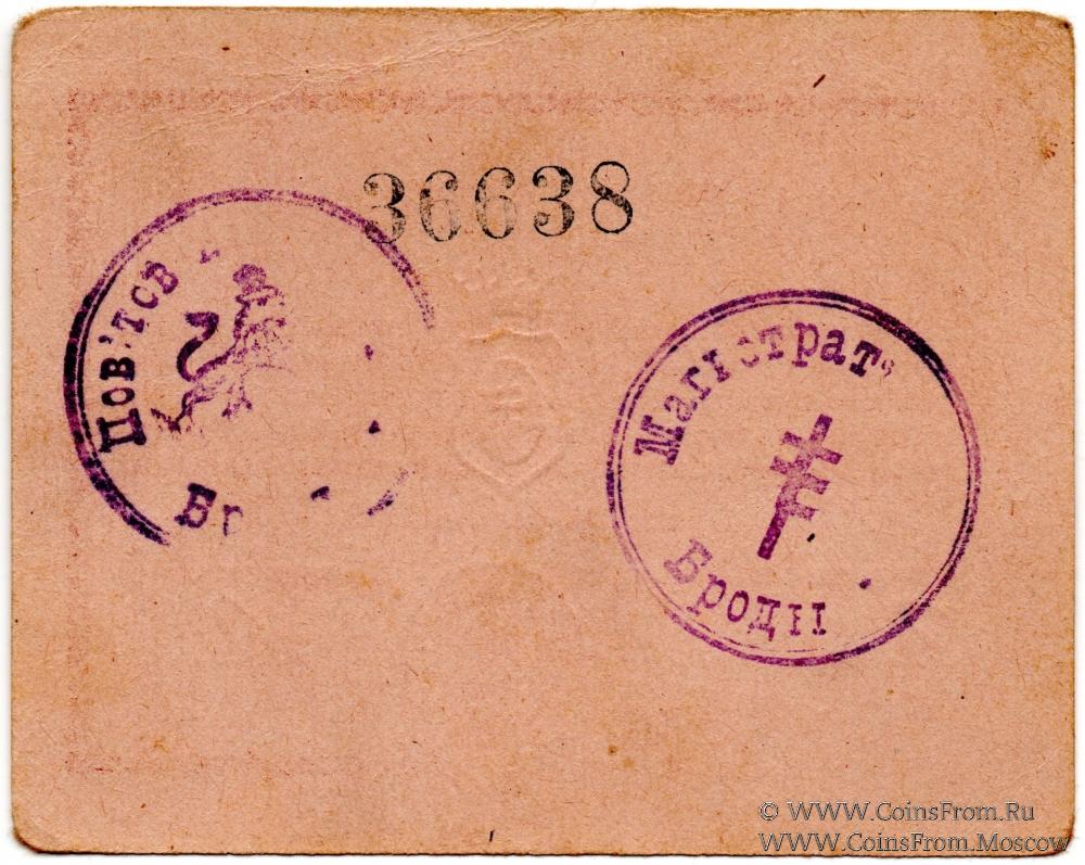 Круглая печать Уездного Комиссариата города Броды на украинском языке: "Повітовій Комісаріат Броди" (по кругу) / Герб в виде льва в короне (по центру).