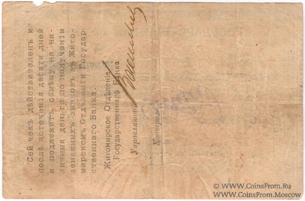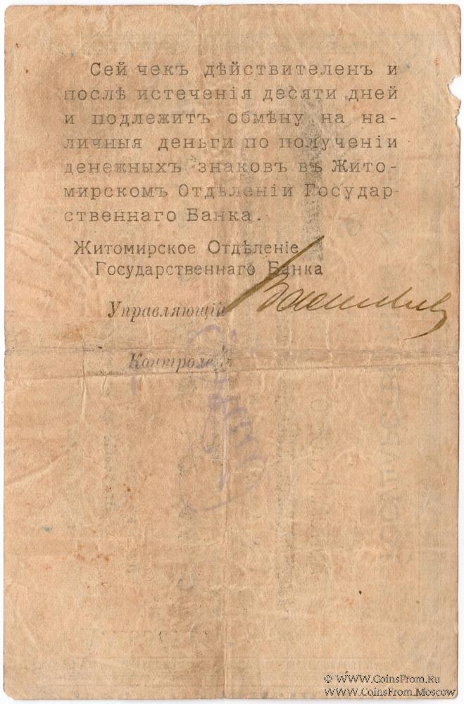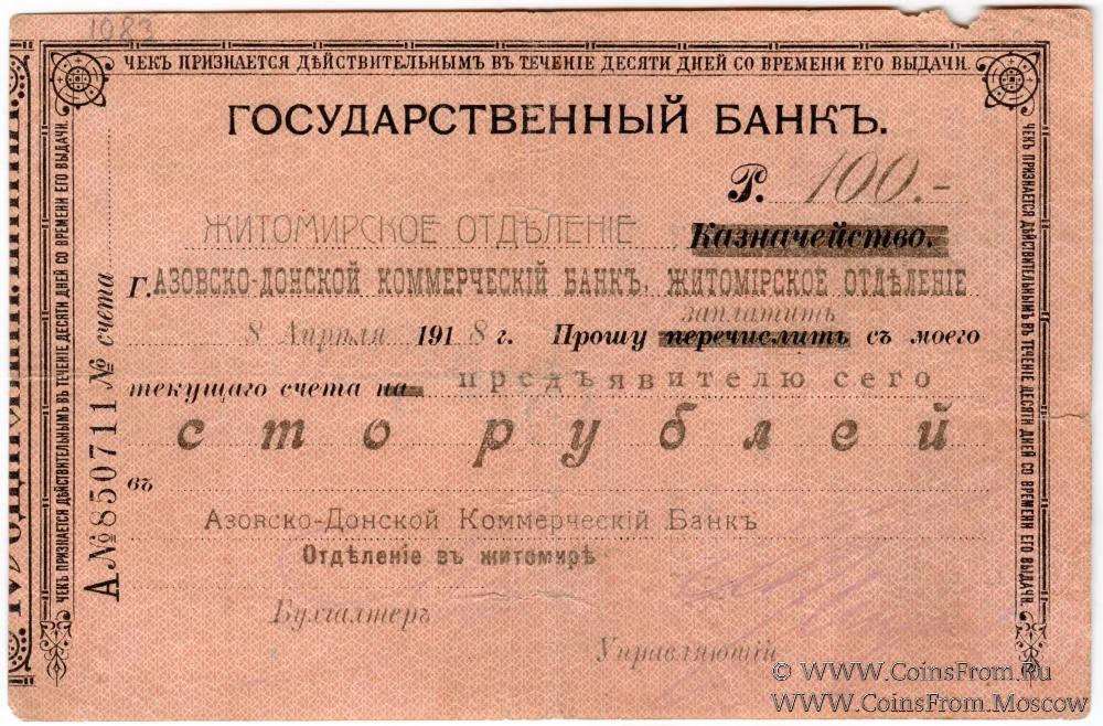 Чек 1918 г. Дата (08 апреля 1918 г.) типографская. С водяным знаком. Фон коричнево-розовый. Житомирское отделение. Азовско-Донской коммерческий Банк. Государственный Банк.