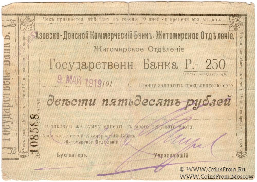 Чек 1919 г. Дата (09.05.1919) штампом. Номер 6-значный черный. Рамка и шрифт - Вариант 2. Надпись шире. Без водяных знаков. Житомирское отделение. Азовско-Донской коммерческий Банк. Государственный Банк.