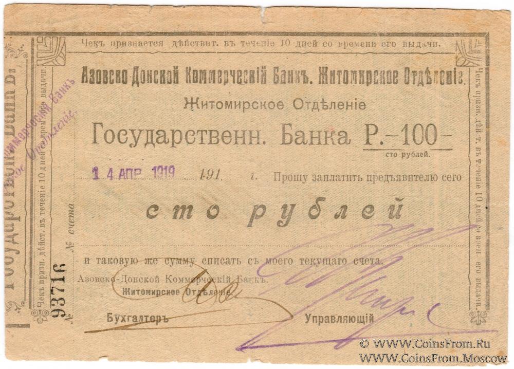 Чек 1919 г. Дата (14.04.1919) штампом. Номер 5-значный черный. Рамка - Вариант 1. Надпись уже. Без водяных знаков. Житомирское отделение. Азовско-Донской коммерческий Банк. Государственный Банк.