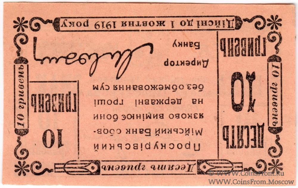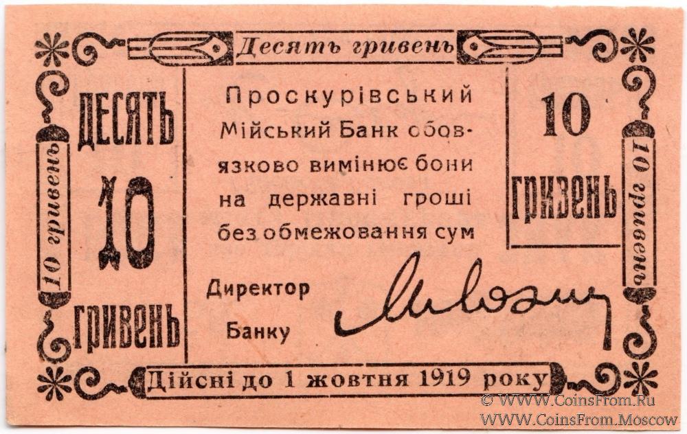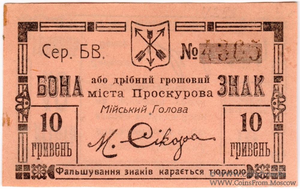 10 гривен (5 карбованцев) 1920 г. (Проскуров)