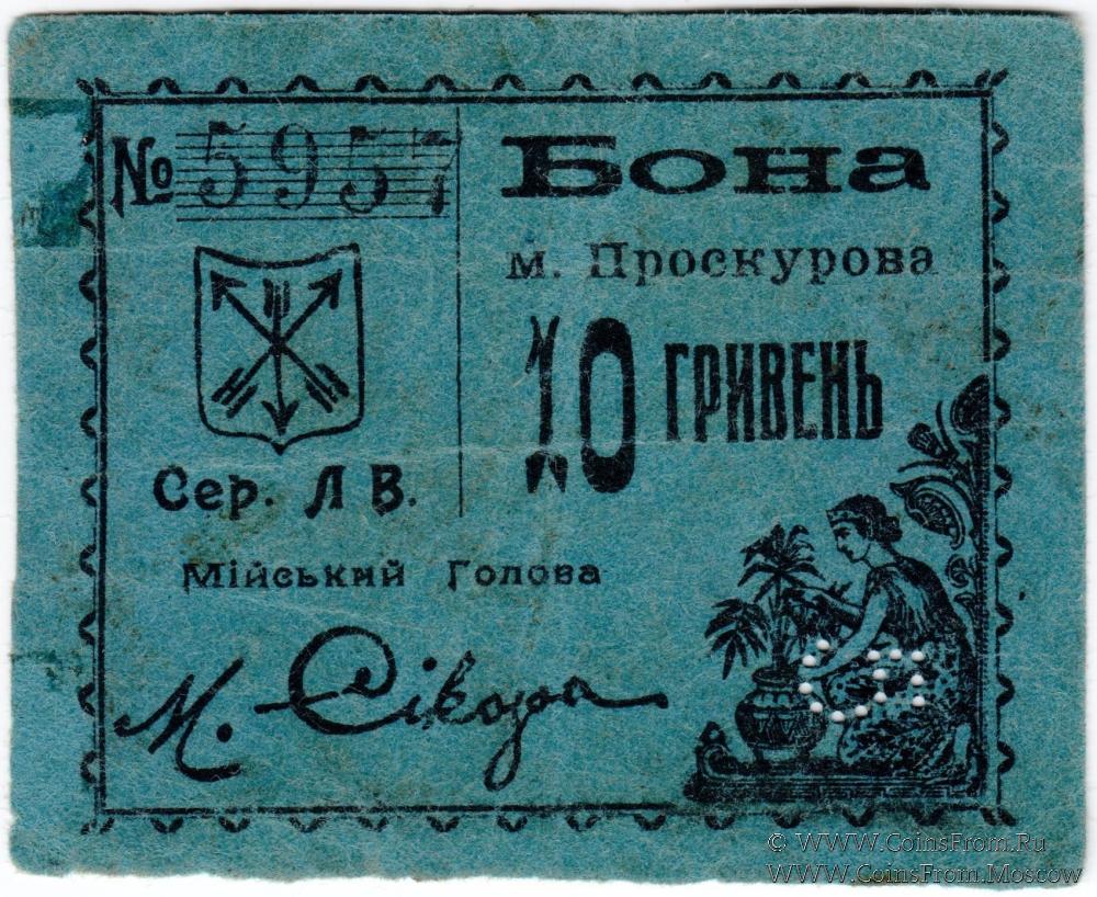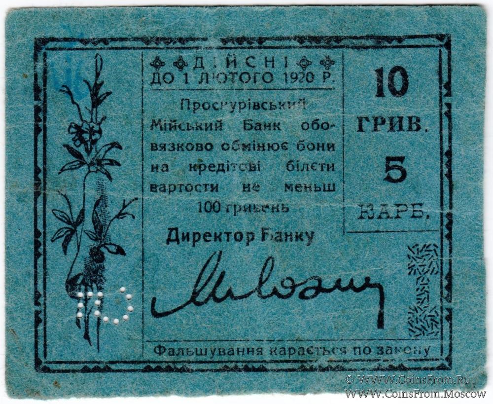 10 гривен (5 карбованцев) 1920 г. (Проскуров)