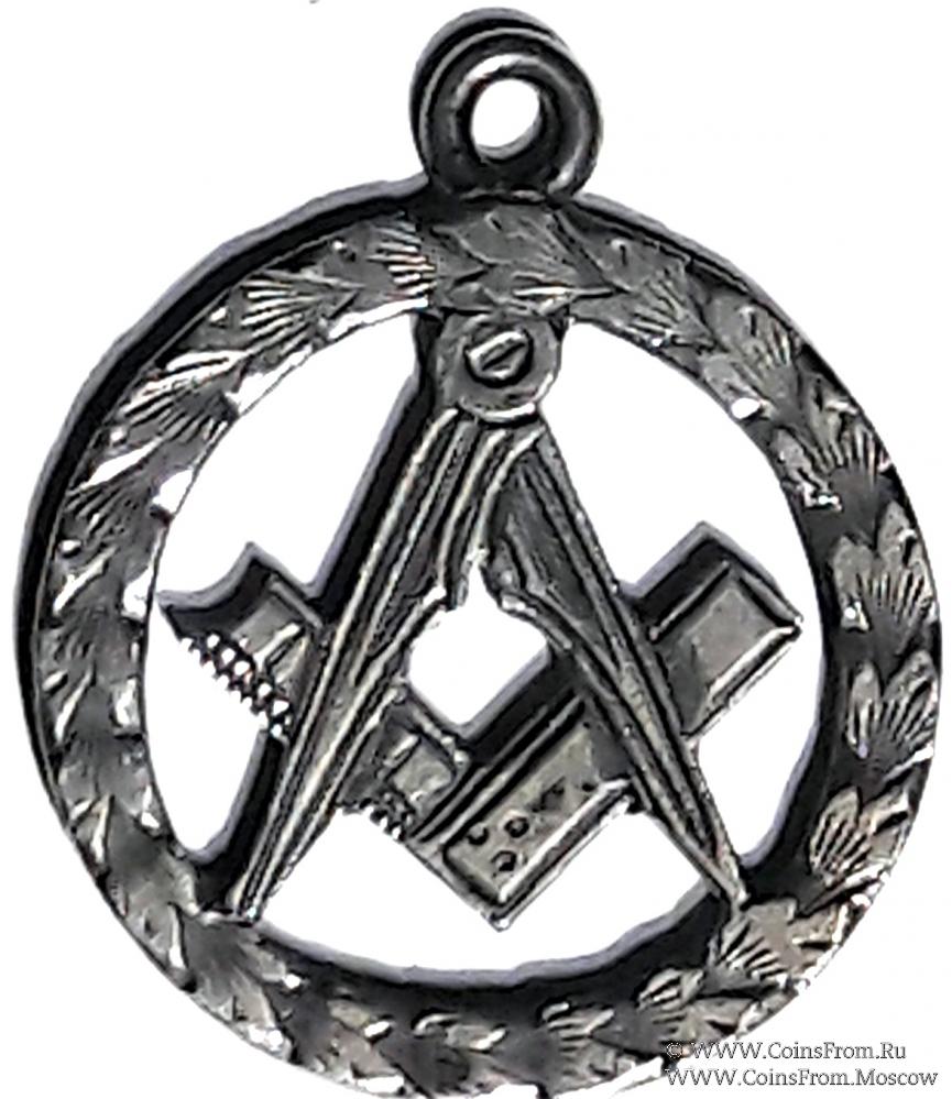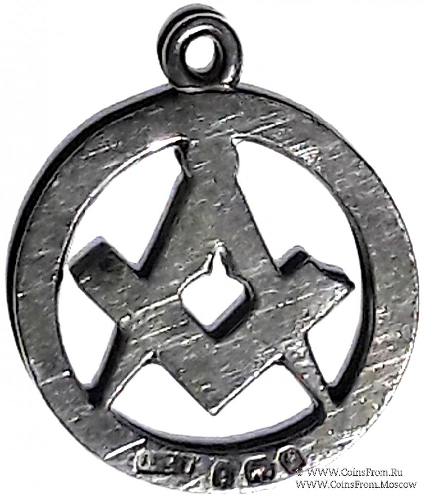 Подвеска в форме круга, образованного венком с кольцом для крепления. В центре круга Наугольник с тремя точками и циркуль. Обе ножки циркуля поверх наугольника - Мастер.