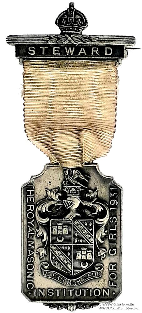 Знак RMIG 1931. STEWARD ROYAL MASONIC INSTITUTION FOR GIRLS – Королевский Масонский институт для девочек.