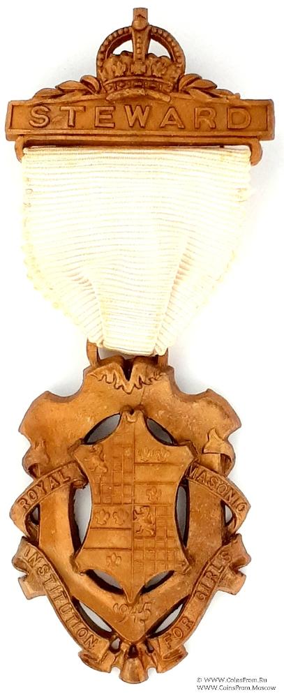 АВЕРС: в форме щита с полым центром. Сверху накладной шестиугольный щит с символикой. С боков и снизу полый щит обвит лентой с наименованием благотворительного заведения (The Royal Masonic Institution for Girls). В нижней части дата 1945.